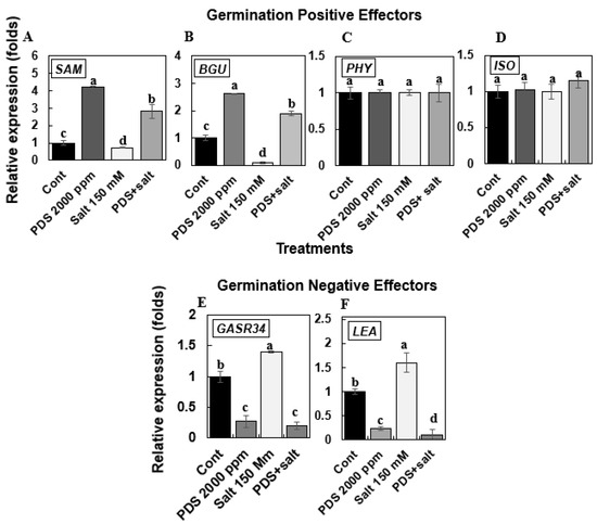 Expression patterns of germination marker genes were analyzed under PDS 2000 ppm and salt (150 and 200 mM). Wheat seeds were germinated in Petri plates supplemented with PDS 2000 ppm. Germinated seeds after 48 h were collected for extraction of total RNA to perform qRT-PCR. (A–D) The bars show the fold increase or decrease in the expression levels of germination positive effector genes upon treatment with PDS 2000 ppm, salt stress, salt + PDS. (E,F) Graphical bars represent the effect of PDS 2000 ppm, salt stress (150 mM) and salt + PDS 2000 ppm on the expression levels of germination negative marker genes in wheat. The y-axis shows fold change in the expression of genes. The x-axis represents the different treatments. All data were analyzed using one-way ANOVA, with multiple comparisons using LSD test at a significance threshold of p ≤ 0.05. Three independent experiments were performed to obtain mean values and standard error bars for each germination experiment. The different lowercase alphabets represent homogeneous subsets and it’s indicates the statistical significantly according to Fisher LSD at level p < 0.05.