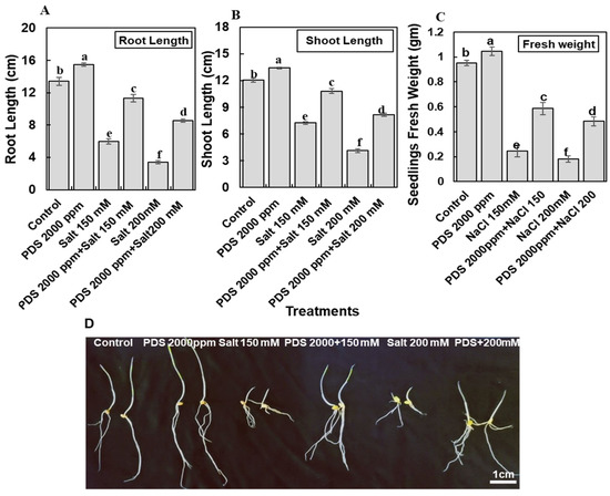 Moreover, application of PDS at 2000 ppm increased seedling fresh weight as compared to control. In a similar way, PDS 2000 ppm alleviated salt stress and the fresh weight (g) of seedlings was found to be more than salt-stress-treated seedlings (Figure 3C).