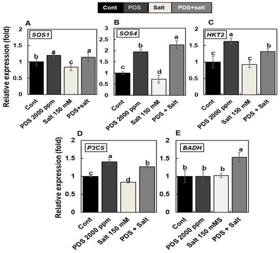 To elucidate how PDS 2000 ppm promotes root and shoot length under salt stress, we analyzed the expression patterns of some salt stress marker genes including SOS1 (salt overly sensitive 1), P5CS (Pyrroline-5- carboxylate synthetase), SOS4 (Salt overly sensitive 4), HKT2 (Cation transporter) and BADH (Betaine-aldehyde dehydrogenase). The results showed that application of PDS 2000 ppm induced expression of SOS4 (2-fold), P3CS (1.5-fold) and HKT2 (1.5-fold) as compared to control (Figure 4A–E). We also analyzed the expression patterns of the salt marker genes under 150 mM salt stress and obtained reduced levels of SOS1, SOS4 and P3CS as compared to control and PDS (Figure 4A,B,D). Supplementation of PDS 2000 ppm to salt 150 mM alleviated salt stress and increased the expressions of SOS4 up to 2.1-fold, HKT2 and BADH up to 1.5-fold and P3CS up to 1.4-fold. It can be deduced that PDS at 2000 ppm dilution actively targets the salt-stress-related genes in the induction of stress adaptation in wheat (Figure 4A–E). However, how PDS induces expression of salt stress marker genes under salt stress needs to be investigated.