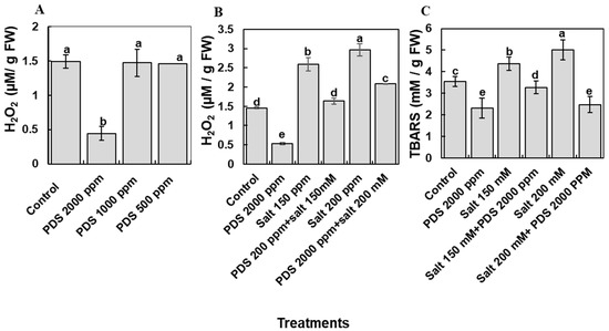 Effect of PDS on reactive oxygen species (ROS) (H2O2) under normal and salt stress. (A) The level of H2O2 was determined under PDS (2000, 1000, and 500 ppm). (B) Salt (150 and 200 mM), and salt supplemented with PDS 2000 ppm. Seven-day-old seedlings were harvested and subjected for the analysis of H2O2. Five seedlings were randomly selected from each treatment and H2O2 was assessed. (C) Lipid peroxidation was analyzed in terms of TBARS using 7-day-old seedlings. Five seedlings were randomly collected from each treatment and TBARS was measured. Data are means ± SE obtained from three different batches of replicates. All data were analyzed using one-way ANOVA, with multiple comparisons using LSD test at a significance threshold of p ≤ 0.05 (n = 5). The different lowercase alphabets represent homogeneous subsets and it’s indicates the statistical significantly according to Fisher LSD at level p < 0.05.