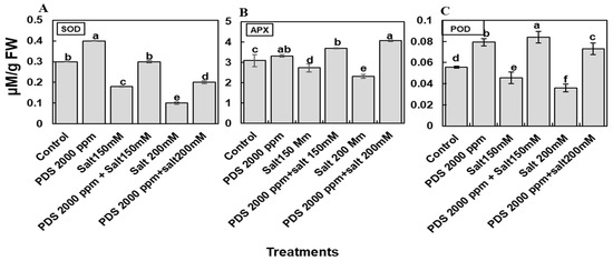 Evaluation of antioxidant activity in PDS and salt-stress-treated wheat seedlings. SOD (A), APX (B) and POD (C). Wheat seeds were treated with PDS (2000 ppm), salinity (mimicked by 150 and 200 mM) and PDS + salt solution (PDS 2000 ppm + 150 or 200 mM). After seven days of germination, five randomly selected seedlings were collected from each treatment and enzymatic activity was measured. Enzymatic activity increased under PDS and PDS added to salt medium. However, the activities of POD, APX, and SOD were deceased under salt stress. All data were analyzed using one-way ANOVA, with multiple comparisons using the LSD test at a significance level of p ≤ 0.05 (n = 5). The different lowercase alphabets represent homogeneous subsets and it’s indicates the statistical significantly according to Fisher LSD at level p < 0.05.