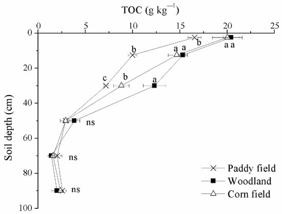 Soil TOC concentrations in the 0–20 cm layer increased significantly after the conversion of paddy fields to woodlands or corn fields (Figure 2). Specifically, soil TOC concentrations increased by 3.88 g kg−1 and 3.47 g kg−1 in the 0–5 cm layer and 5.33 g kg−1 and 4.68 g kg−1 in the 5–20 cm layer 13 years after conversion from paddy fields to woodlands and corn fields, respectively (Figure 2). In the 20–40 cm layer, the woodland soil had the greatest TOC concentrations (12.3 g kg−1), which were 5.13 g kg−1 and 3.5 g kg−1 higher than the TOC concentrations in the paddy and corn field soils, respectively. This is possibly attributed to more root residue input and labile carbon leaching. No significant differences in TOC concentrations were observed in the 40–100 cm soil layers among the three land-use systems.