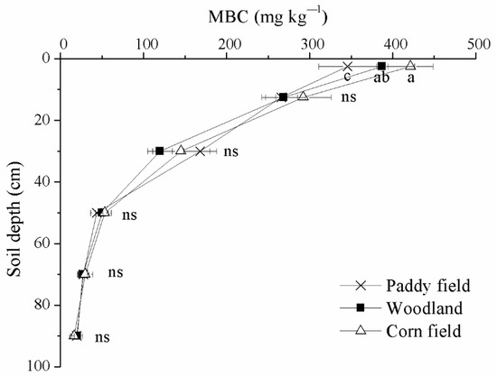 Soil MBC concentrations decreased sharply with increasing soil depth for the three different land-use soils (Figure 5). Significant differences in soil MBC levels were only observed in the surface soil layer (0–5 cm). Corn field soils had the highest MBC concentration (421 mg kg−1), followed by that of the woodland and paddy field soils (Figure 5).