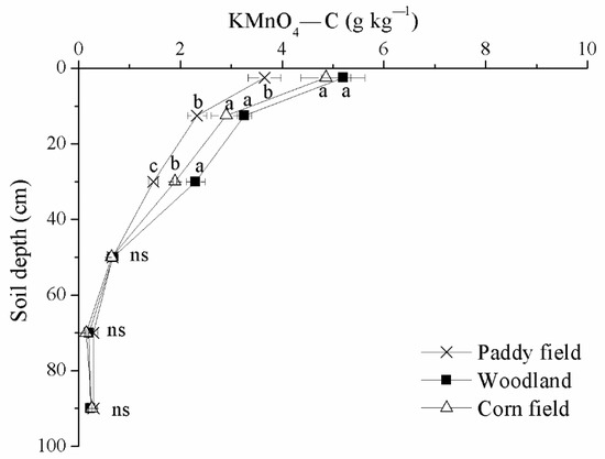 Soil potassium permanganate organic carbon (KMnO4–C) content at different soil depths under different soil types. Horizontal bars represent standard deviations. Different lower-case letters in the same soil depth indicate the significant differences at the 5% level of probability. NS indicates no significant differences at the 5% level of probability.