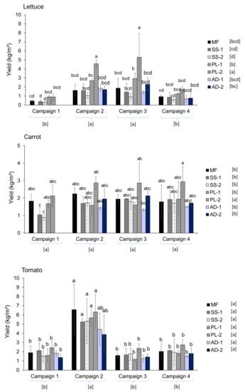 The results of the statistical analyses showed that the variables treatment, campaign and their interaction (treatment*campaign) had significant effects in explaining the variability of lettuce (p < 0.0001), carrot (p = 0.001) and tomato (p < 0.0001) yields (Figure 2).