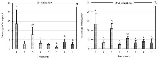 Overall, improved efficacy in controlling storage rots compared to the control was observed for Treatments 2, 4, 6, 7, and 8, with no significant differences among these treatments. Treatment 3 did not differ significantly from the control group. Although a lower infestation than in the control group was achieved by combining captan and trifloxystrobin pre-harvest (Treatment 5), captan alone (Treatment 3) did not significantly reduce the infection rates compared to the control. Fungal rot incidence did not differ between evaluation times for each treatment (p > 0.05).