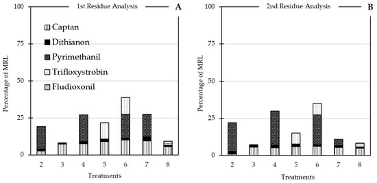Results of MRL analysis of experimental treatments 2 to 8 after the application of pyrimethanil shortly after harvest (A) and after 5 months of RA storage (B). Cumulated percentages of maximum residues.