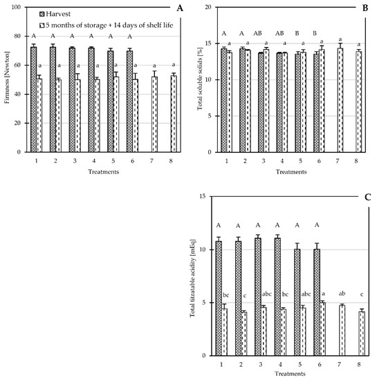 (A) Fruit firmness, (B) total soluble solids content, and (C) titratable acidity at harvest and after 5 months of storage plus 2 weeks of shelf life, as affected by various pre- and post-harvest fungicide applications. Means with identical uppercase letters did not differ significantly at harvest, and means with identical lowercase letters did not differ significantly after storage and shelf life (Tukey Test α = 0.05). The standard deviation of the mean is denoted by a capped bar at the top of the column.