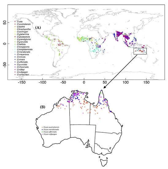 (A) Global distribution of all the wild Oryza species as described in [14], the phylogenetics and the genomic constitution of these wild relatives of rice are reviewed in [11]; (B) Distribution of wild Oryza species in Australia: O. rufipogon in violet, O. meridionalis in blue, O. officinalis in green, and O. australiensis in red. Based on occurrence records provided by [15].