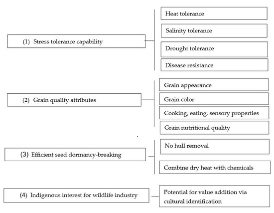 Australian wild Oryza have several advantageous features to aid in their commercial production (Figure 3). They exhibit a tolerance for a range of biotic and abiotic stresses as they occur in environments that are often harsh [4]. Also, their grain quality attributes suggest their potential success for commercial production as a high-quality product [6,7,8]. Further, the seed biology and seed dormancy breaking techniques of some Australian wild Oryza species are understood which could underpin their successful cultivation under paddy conditions [33].