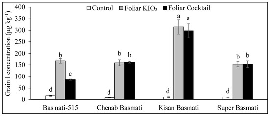 Overall, cv. Kisan Basmati showed a substantially higher response to foliar treatment of I resulting in two-fold higher brown rice I concentration as compared to other cultivars. The average I concentration in brown rice with a foliar application of KIO3 alone or with cocktail was 126 μg kg−1 in cv. Basmati-515, 160 μg kg−1 in cv. Chenab Basmati, 306 μg kg−1 in cv. Kisan Basmati, and 153 μg kg−1 in cv. Super Basmati.