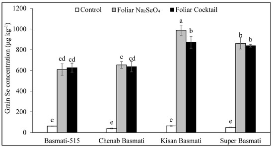 Likewise, the inherent Se concentration in the brown rice grains of all the cultivars was low, and with the foliar application of Na2SeO4 alone or contained in the cocktail, it increased substantially, from a mean value of 54 to 760 µg kg−1 (p = 0.05; Figure 2). All cultivars responded equally to the foliar application of Na2SeO4 alone or in cocktail except for cv. Kisan Basmati, which outperformed other cultivars when sprayed with Na2SeO4 alone; however, with cocktail treatment, this cultivar maintained grain Se concentration at the level of cv. Super Basmati (Figure 2). The absorption and phloem mobility of Se is well documented in plants [73,74,75] and is confirmed in this study by the efficient deposition of Se in rice grains. Cakmak et al. [57] found the foliar application of Se along with I and Zn as a feasible technique for improving rice grain Se concentration. Similarly, the combined application of Se and Zn was highly effective in increasing the grain concentration of these micronutrients in rice [54]; however, a dose and cultivar-dependent antagonistic effect of Zn was observed on grain Se concentration, as shown in the case of cv. Kisan Basmati (Figure 2) in the current study. Moreover, the higher Se concentration of cv. Super Basmati is directly related to the concentration effect of lower grain yield as compared to other cultivars, especially cv. Chenab Basmati. However, as was observed in the case of I, cv. Kisan Basmati outperformed all cultivars in terms of Se concentration in brown rice in spite of the higher grain yield as compared to cv. Super Basmati and cv. Basmati 515 (Table 2), which could be attributed to the efficient absorption, translocation, and deposition of foliar-applied Se. Future studies should focus on better understanding the genotypic variation in absorption and seed deposition of foliarly applied Se.