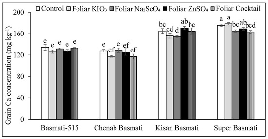 Foliar treatments did not affect concentrations of Cu, Fe, and Mn in brown rice, irrespective of cultivars; however, the differences among cultivars were significant for all micronutrients (p ≤ 0.05; Table 4). On average, the highest Cu concentration in brown rice was recorded in cv. Kisan Basmati (3.5 mg kg−1) followed by cv. Super Basmati (2.9 mg kg−1), cv. Chenab Basmati (2.3 mg kg−1), and cv. Basamati-515 (2.0 mg kg−1); however, the last two cultivars had statistically similar concentrations. The cultivar-wise order of Fe concentration in brown rice was Super Basmati > Kisan Basmati > Chenab Basmati > Basmati-515. Brown rice Mn concentration was also higher in cv. Super Basmati than the rest of the three cultivars having statistically similar Mn concentrations. The calcium concentration in brown rice of cv. Kisan Basmati and cv. Super Basmati was significantly higher (up to 37%) than cv. Basmati-515 and cv. Chenab Basmati (p ≤ 0.05; Figure 3). On average, the former group contained 39 mg higher Ca per kg of grains than the latter group, and differences between the cultivars within groups were non-significant. Compared to control treatment, foliar micronutrient treatments did not affect grain Ca concentration in cv. Basmati-515 and cv. Chenab Basmati. However, there was a statistically significant decreasing trend in grain Ca concentration with foliar application of KIO3 in cv. Kisan Basmati and both by KIO3 and cocktail in cv. Super Basmati (p ≤ 0.05; Figure 3).
