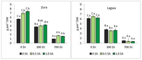 Biomass of wheat shoots–mean over 2 years. Means marked with different capital letters differ significantly between the Zn levels within each level of SA, and means marked with different small letters differ significantly between the SA levels within each level of Zn (according to Tukey’s HSD test at p < 0.05). Vertical bars represent standard errors (n = 4).