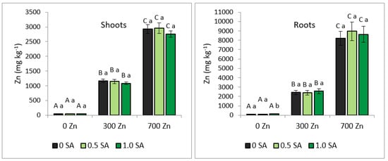 Zn concentration in shoots and roots in Zura cultivar–mean over 2 years. Means marked with different capital letters differ significantly between the Zn levels within each level of SA, and means marked with different small letters differ significantly between the SA levels within each level of Zn (according to Tukey’s HSD test at p < 0.05). Vertical bars represent standard errors (n = 4).