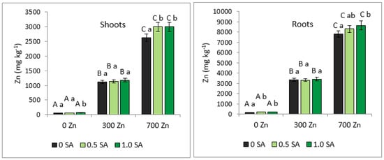 Zn concentration in shoots of Zura and Lagwa cultivars grown on soil uncontaminated with this element (Zn0) and without SA, was 49 and 57 mg kg−1, respectively, while in roots it was 116 and 168 mg kg−1 (Figure 2 and Figure 3).