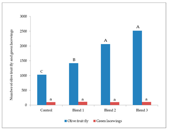 3.1. Bactrocera Oleae and Green Lacewings Attraction to Three Blends of OFF-Associated Yeast Volatile Compounds in Olive Orchard