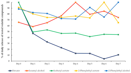 3.3. Daily Volatile Release of Investigated Blends in the Field
