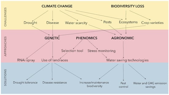 In addition to agronomic measures such as the shift in planting dates, one of the most promising adaptation strategies to face climate change is the development of new cultivars better adapted to biotic and abiotic stresses. During the evolutionary history of wheat, its genetic diversity has suffered reductions in several steps of the domestication and breeding process [33]. The first step to obtain improved varieties is to generate variability, and this variability obtained from crosses of modern varieties (also known as “elite varieties”) is nowadays limited. For this reason, landraces should be considered a key source of genetic resources to be exploited in the future [34]. Landraces may provide sources for adaptation, increased biomass, thousand kernel weight [33], drought tolerance [35], and disease resistance [36,37], among other benefits. The following are some innovative concepts provided to use landraces for coping with biotic and abiotic stress.