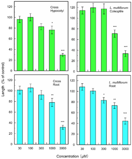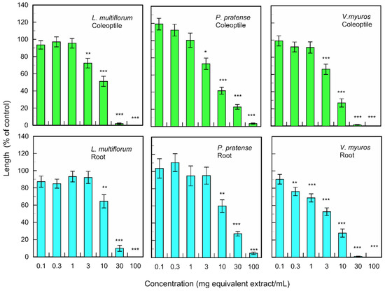 Effects of the extracts of M. glyptostroboides leaves on the growth of roots and coleoptiles of L. multiflorum, P. pretense, and V. myuros. Concentrations of tested samples corresponded to the extracts obtained from 0.1, 1, 3, 10, 30, 100, and 300 mg dry weight equivalent extract per mL. Means ± SE from three independent experiments with 10 plants for each determination are shown. Asterisks indicate significant differences between control and treatment: *, p < 0.05, **, p < 0.01, ***, p < 0.001.