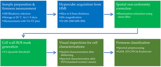 As shown in Figure 1, our approaches for this study included sample preparation, firmness measurement for ground-truth blueberry firmness, and hyperspectral image (hypercube) acquisition with HMI. The next step was image and data preprocessing for spatial non-uniformity correction and mask generation of cell wall regions of interests (ROI). The last step involved visual inspections for cell characterization, and firmness classification.