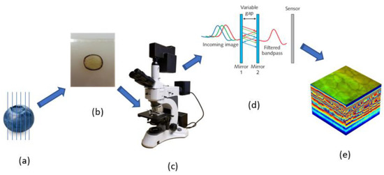Schematic of sample preparation and hyperspectral microscope image measurement. (a) Blueberry sample with cutting direction; (b) blueberry on slide for scanning; (c) hyperspectral microscope; (d) Fabry–Perot Interferometer (FPI) for acquiring hyperspectral data; (e) hypercube from blueberry sliced sample.