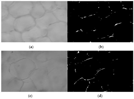 After correcting the spatial non-uniformity in hypercubes, ROI masks of cell walls were generated using the quantile thresholding method [21]. To examine the spectra of parenchyma cell walls in blueberries, it was essential to create a proper ROI mask image of the cell walls for each hypercube. However, the initial inspection of the hypercubes presented some challenges because (a) the cells were nearly transparent, showing blurry cells behind, (b) many cells overlapped each other, (c) only a part of the cell wall around a cell was visible, and (d) different degrees of blurriness on different cell walls made it hard to recognize cell walls. Instead of engaging in time-consuming manual ROI mask generation, we utilized an improvised solution using quantile threshold because perfect or near-perfect precision of the cell wall ROIs was difficult even with manual mask image creation and was not a goal of this study. To create cell wall ROIs using quantile thresholding, we obtained 1% quantiles of average band images of peak wavelengths (530 nm and 680 nm) and thresholded the average band images with the 1% quantiles as shown in Figure 4. The threshold value 1% was chosen because ROIs with 1% had fewer artifacts from the cell walls behind foreground cells than those with 2% and 5%, and the average spectra between ROIs of 1% and 5% were not statistically different to characterize based on blueberry firmness.