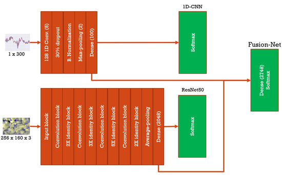 Fusion-Net is another deep learning algorithm on multiple forms of predictors [27]. For example, the original algorithm accepted three different forms of predictors, such as spectra, morphological properties, and greyscale images in our study. We modified its architecture and implementation for a Fusion-Net model of firmness classification on two forms of predictors (i.e., spectra and three-band images), as shown in Figure 5. The Fusion-Net consisted of 1D-CNN and ResNet50 without their last softmax layers. The last layers of the two subnetworks were combined with a dense (or fully connected) layer of 2748 units before the final softmax layer of the Fusion-Net. ResNet50 was one of the popular DL models for image classification, partly because the model resolved the vanishing gradient problem, causing more complex networks to learn less by employing skip or near-skip connections within identity and convolutional blocks [28,29]. Except for input-related settings (e.g., image dimensions) and overfitting-related parameters (e.g., batch size, drop rate, and learning rate), most hyperparameters of ResNet50 from [28] were retained in Fusion-Net. Like 1D-CNN, critical hyperparameters of the model were obtained through multiple trials of model training and evaluation using the TPE method with the fixed batch size 1, before building the final Fusion-Net model. Training the model took about 12 min.