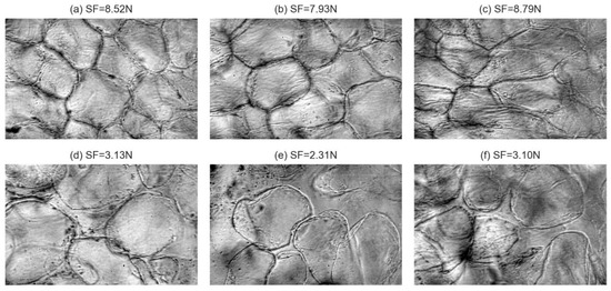 A deblurred 530 nm image was examined for spatial cell characteristics based on different firmness. Figure 6 showed the image patterns of parenchyma cells in the firmest blueberries (SF 7.85–8.83 N, (a)–(c)), and in the softest (SF 1.96–3.92 N, (d)–(f)) harvested from the United States. Most cells in the firm blueberries had tight cell-to-cell adhesions, thick, dark, and stiff (or straight) cell wall segments, and small intercellular spaces. In addition, variation of cell area was relatively small for the firm blueberries. Some cells in the soft blueberries lost cell-to-cell adhesions, had thin, light, and loosened (or round) cell wall segments while showing large intercellular spaces. Accordingly, overlapping cells and irregular cell shapes were also visible, while cell area variation appeared high for the soft blueberries.
