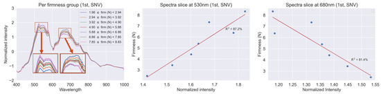 Average spectra of cell walls among different firmness; two plots on the right side show a linear relationship between firmness and average intensity normalized with SNV at each peak wavelength (530 nm and 680 nm).