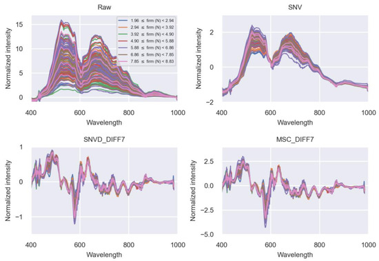 Average spectra of cell walls per blueberry among different firmness with three different preprocessing methods, Raw (top-left), SNV (top-right), SNVD-DIFF7 (bottom-left), and MSC-DIFF7 (bottom-right).