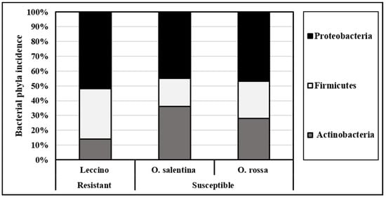 Based on the Bayesian RDP classifier, the taxonomy of the 16S rRNA sequences was examined at the phylum level and the most sequenced phyla associated with the sapwood of all olive varieties were Proteobacteria, Actinobacteria and Firmicutes. Sequences assigned to Proteobacteria and Firmicutes were more abundant in the bacterial community of ‘Leccino’ sap (52.4 and 34.2%, respectively) than in the bacterial community of ‘O. salentina’ and ‘O. rossa’ sap. Conversely, sequences assigned to the phylum Actinobacteria were more frequent in the sap of ‘O. salentina’ (36%) and ‘O. rossa’ (28%) than in the community of ‘Leccino’ sap (14%) (Figure 1).