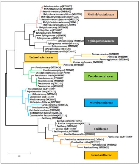 Phylogenetic tree constructed by Maximum Likelihood method and based on 16S rDNA gene analysis of the most frequently identified culturable bacterial endophytes from olive sapwood, in reference to closest type strains obtained from the Ribosomal Database in NCBI. The accession numbers (MT556422-MT55639, MT973971) (supplementary file 7) refer to our annexed bacterial sequences in NCBI.