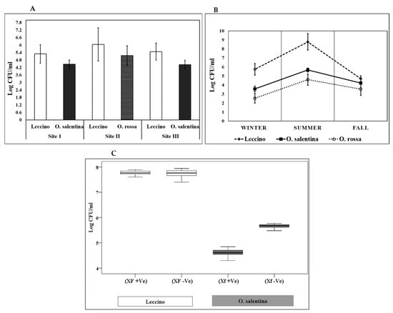 The statistical approach was employed to investigate the influence of the explanatory variables (sampling sites, seasonality, Xf-infection) on the response variable (CFU/mL). Primarily, the univariate analysis of the interactions of (site×season) (site×variety) showed no significant effect on the plate count indicator (p > 0.05), whereas the interaction of (season×variety) exclusively revealed a significant effect on the plate count indicator (p < 0.001). Considering the variety variable, average CFU revealed a higher bacterial count in sapwood of ‘Leccino’ compared with ‘O. salentina’ and ‘O. rossa’ at all assessed sampling sites studied (p = 0.006, p = 0.004, respectively). In addition, the bacterial occurrence in samples of ‘Leccino’ and ‘O. salentina’ varied slightly within sampling sites, and there was a consistent pattern in terms of zone effect producing more colonies than other zones (Figure 3A) (supplementary file 1).