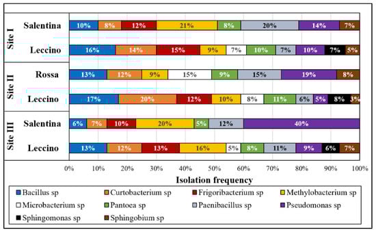 A further analysis was performed, as shown in Figure 4, to investigate how bacterial populations of the ten major genera differed by cultivar and sampling site. In comparison with the cultivar ‘O. salentina’, the cultivar ‘Leccino’ exhibited an exclusive isolation of the genera Okibacterium and Sphingomonas at sites III and I. A similar representation was seen when comparing the genera from the sapwood of ‘Leccino’ and ‘O. rossa’ at the sampling site II, as the genera Frigoribacterium and Sphingomonas were not found in the sapwood of ‘O. rossa’. Across all sampling sites, the genera Bacillus, Curtobacterium and Pantoea were most frequently isolated from the sapwood of ‘Leccino’, whereas Pseudomonas was predominant in the sapwood of ‘O. salentina’ and ‘O. rossa’. At sampling site I, the genera Bacillus, Curtobacterium and Pantoea showed a higher frequency of isolation from the sapwood of ‘Leccino’ than from the sapwood of ‘O. salentina’. On the other hand, Paenibacillus and Pseudomonas species were more abundant in the sapwood of ‘O. salentina’. At the sampling site II, the above genera showed similar frequency in ‘Leccino’, but Paenibacillus, Pseudomonas and Okibacterium were more frequent in the sapwood of ‘O. rossa’. As the sampling site III represented olive trees under the infection pressure of Xf, the sapwood of ‘O. salentina’ showed the lowest bacterial diversity and isolation frequency except for the genus Pseudomonas (Figure 4).