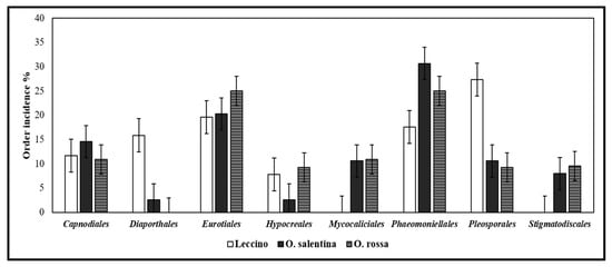 Fungal endophytes were isolated from all processed plants. The imprint tests indicated that surface disinfection procedures efficiently eliminated epiphytic fungi (data not shown). A total of 2273 fungal colonies were obtained from 240 twigs collected from 30 olive trees. However, fungal colonies were found only in 77.5% (186/240) of the total twigs collected, regardless of sampling sites and olive cultivars. The fungal isolates showed different characteristics in terms of colony color, morphology, and growth rate. Based on their characteristics, the isolates were assigned to different morphological groups, of which 60 representative isolates were molecularly identified by sequencing the ITS region. This resulted in 33 taxa belonging to eight orders representing the clustered groups (Figure 5). Pleosporales, Eurotiales and Phaeomoniellales proved to be the most abundant orders and accounted for more than half of the assigned isolates in all olive species. In contrast, the orders Hypocreales, Mycocaliciales and Stigmatodiscales were the less abundant. The diversity of orders among endophytic fungi was higher in the twigs of ‘O. salentina’ than in those of ‘Leccino’ and ‘O. rossa’. Isolates of ‘O. rossa’ were never assigned to the order Diaporthales, and none of the isolates of ‘Leccino’ was assigned to the order Stigmatodiscales (Figure 5).