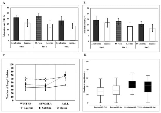 Illustrations of fungal endophytes occurrence and variations. (A) The histogram illustrates the variation of fungal colonization rates between different olive varieties belonging to different sampling sites. Bars represent SEM. (B) The histogram shows the variation of fungal isolation rates between different olive varieties belonging to different sampling sites. Bars represent Std. (C) The curves illustrate the representative mean number of fungal isolates ± Std, which represents the seasonal dynamic of fungal endophytes occurrence within different olive varieties. (D) Boxplot depicts the interactive effect of ‘Leccino’ and ‘O. salentina’ health status varieties on the mean number of isolates.