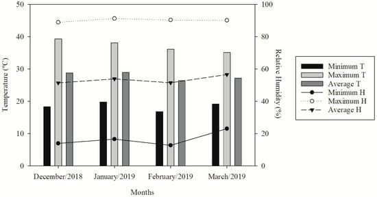 Greenhouse climate conditions were logged throughout the experiment using Datalogger (Instrutherm, HT-500: São Paulo, Brazil) (Figure 1). Photosynthetically active radiation (PAR) within the greenhouse was monitored by a quantometer (QMSS-E Quantum Apogee PAR Meter: Logan, UT, USA), with an average daily reading of 833.5 μmol m−2 s−1.