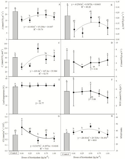Physiological characteristics of soybean plants subjected to the application of different doses of biostimulant under water deficit. CO2 assimilation—A (A), stomatal conductance—gs (B), internal CO2 concentration—Ci (C), transpiration—E (D), leaf temperature (E), water-use efficiency—WUE (F), carboxylation efficiency—CE (G) and SPAD index (H). Means followed by the same letter do not differ from each other according to the Tukey test at 5% probability. ns = not significant.