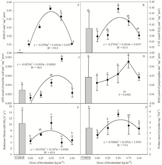 Activity of antioxidant enzymes and compound in soybean plants subjected to the application of different doses of biostimulant under water deficit. Superoxide dismutase—SOD (A); catalase—CAT (B); ascorbate peroxidase—APX (C); peroxidase—POX (D); reductase nitrate (E) and proline (F). Means followed by the same letter do not differ from each other according to the Tukey test at 5% probability. ns = not significant.