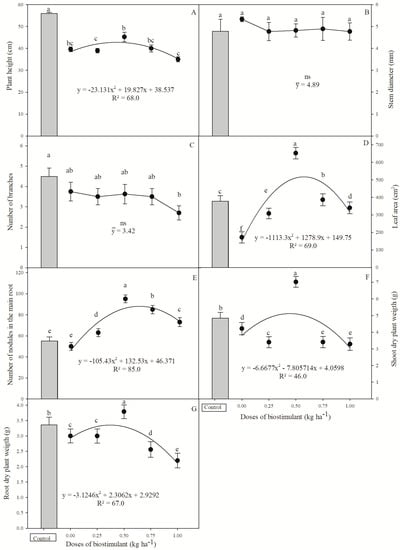 Biometric characteristics of soybean plants subjected to the application of different doses of biostimulant under water deficit. Plant height (A), stem diameter (B), number of lateral branches (C), leaf area (D), number of nodules in the main root (E), shoot dry matter weight (F) and root dry matter weight (G). Means followed by the same letter do not differ from each other by the Tukey test at 5% probability. ns = not significant.