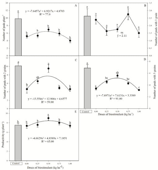Components of production of soybean plants subjected to the application of different doses of biostimulant under water deficit. Number of pods per plant (A), number of pods with 1 grain (B), number of pods with 2 grains (C), number of pods with 3 grains (D) and productivity (E). Means followed by the same letter do not differ from each other according to the Tukey test at 5% probability. ns = not significant.