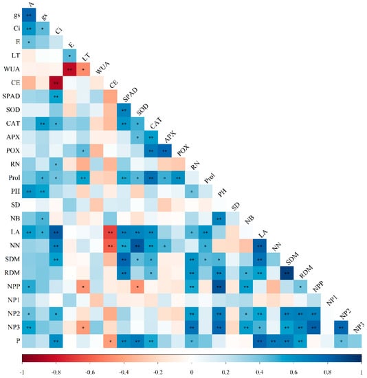 Pearson’s correlation between CO2 assimilation rate (A), stomatal conductance (gs), transpiration rate (E), leaf temperature (Tl), intercellular CO2 concentration (Ci), Water-use efficiency (WUE), carboxylation efficiency (CE), SPAD index (SPAD), superoxide dismutase (SOD), ascorbate peroxidase (APX), catalase (CAT), peroxidases (POX), nitrate reductase (RN), proline (Prol), leaf area (LA), number of branches (NB), shoot dry matter mass (SDM), root dry matter mass (RDM), height of plants (PH), diameter of plant stem (SD), number of primary stem nodes (NN), number of pods per plant (NPP), average number of pods with 1 grain (NP1), average number of pods with 2 grains (NP2), and average number of pods with 3 grains (NP3), and productivity (P). ** Significant at 5% * Significant at 1%.