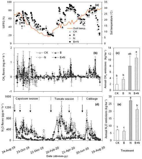 Seasonal dynamics of soil temperature and WFPS (a), CH4 fluxes (b), Annual CH4 emmisions (c), N2O fluxes (d) and Annual N2O emissions (e) across treatments from the greenhouse vegetable cropping system over the 2019–2020 annual cycle. CK represents the Control, no N fertilizer and biochar application; B, biochar alone; N, N fertilizer alone; B+N, N fertilizer and biochar amendment. Solid and dotted arrows indicate basal and topdressing events, respectively.