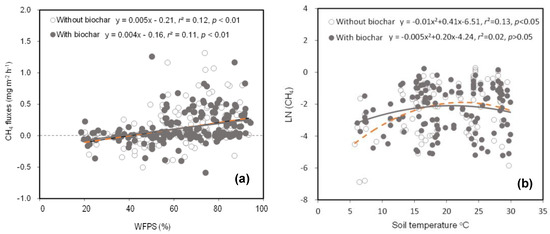In contrast, N fertilizer application significantly increased CH4 emissions, particularly when biochar was also applied (Table 3, Figure 1c), suggesting that biochar-introduced C into the soil, improving soil C/N ratio towards enhancing activities of methanogens. Nevertheless, the repsonse of soil CH4 fluxes to N fertilization has been inconsistent among earlier studies [10,31,32,33], a huge dependency on the N fertilizer type or rate, soil moisture and other soil properties has been reported [34,35,36,37]. In this study, the N fertilizer-increased soil CH4 emissions may be presumably associated with the stimulated crop growth, and in turn more root exudated C substrate that was provided for methanogenesis resulting from bochar amendment [38]. However, no significant interactive effect of biochar with N fertilizer has been found on CH4 emissions over the annual experimental period (Table 3).