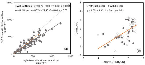 Biochar significantly decreased the annual soil release rate of N2O by 22% and 12% for the N fertilized and unfertilized plots, respectively. This mitigation effect of biochar was further enhanced with fertilizer N combination (Table 3). On average, biochar combined with N fertilizer application reduced fertilizer N-induced soil N2O emissions by 31% relative to N applied alone (1.94%). The regression slope of N fertilizer presence relative to its absence was significantly lower than the value when soil N2O fluxes in biochar-treated soils were plotted against those without biochar amendment (Figure 3a: slope = 0.74, p < 0.001), indicating that the mitigation capacity of N2O resulting from biochar addition would be enhanced with N fertilizer input in the vegetable cropping system.