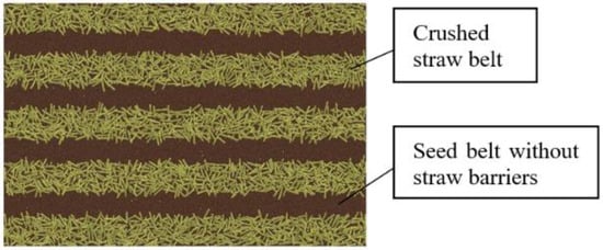Table 1. The working principle is as follows: the crushed straw is sprayed from the rear cover of the straw-crushing device and then divided by the straw deflector. The purpose of this process is that a “no-straw” seed strip is formed directly below the wide-boundary fertilization device, and a regular crushed straw belt is formed directly below the interval between adjacent wide-boundary fertilization devices. Meanwhile, fertilization is carried out by the wide-boundary fertilization device located under the straw deflector on the full width of the 240 mm “no-straw” seeding belt. Then, the wide-boundary seeding device carries out strip rotary plowing and wide-boundary sowing on the seeding belt covered with fertilizer. After the operation, the field showed an alternating longitudinal arrangement of a 240 mm “no-straw” seeding belt and a 300 mm crushed straw belt. The land surface after sowing is shown in