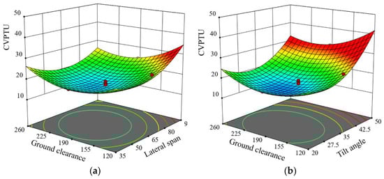 Figure 10a. When ground clearance is determined, with the increase in the lateral span value, CVPU first decreases and then increases; when the lateral span is determined, with the increase in ground clearance, the CVPU first decreases and then increases. When the focal length coefficient and lateral span are taken as the intermediate value (1.5 and 65 mm), the interaction influence of tilt angle and ground clearance on the CVPU is shown in
