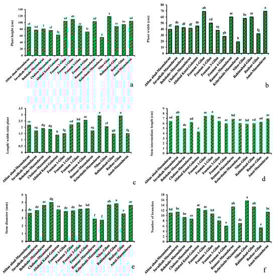Mean comparisons for plant height (a), plant width (b), height-to-width ratio (c), internode length (d), stem diameter (e), and lateral branch number (f) of 15 different ecotypes of M. aquatica collected from the Hyrcanian hotspot of Iran. Different letters indicate significant differences according to the LSD test at p < 0.05.