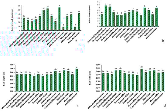 Mean comparison for lateral branch length (a), collar diameter (b), leaf length (c), and leaf width (d) of different ecotypes of M. aquatica collected from the Hyrcanian hotspot of Iran. Different letters indicate significant differences according to the LSD test at p < 0.05.